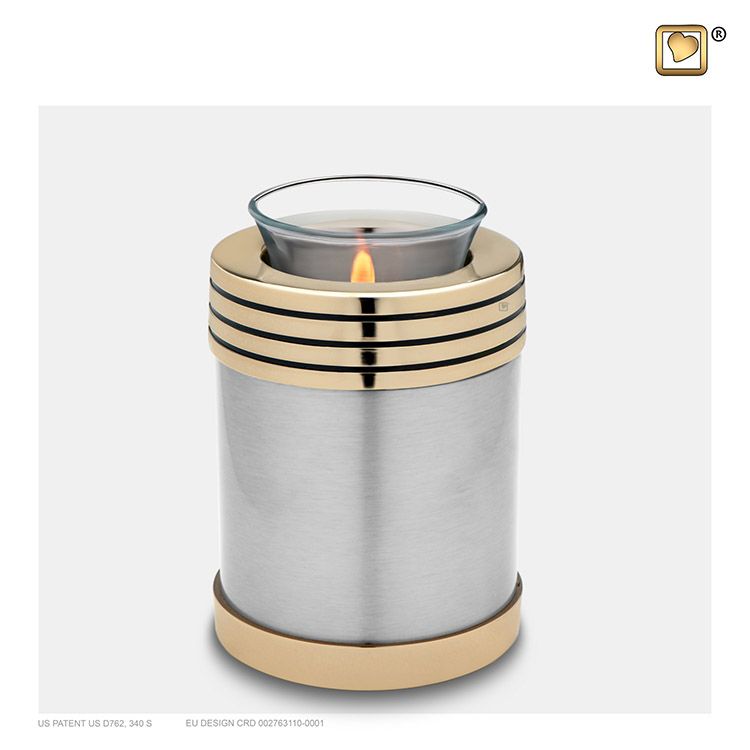 LoveUrns Kerzenhalter Urne Elegante Zinnfarbene Goldene Zierkanten (0,45 Liter)