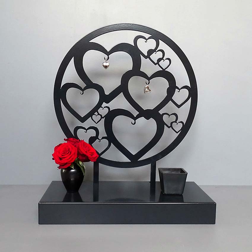 Abmessungen (HxBxT): Urnenplateau: 30 cm x 15 cm x 2,5 cm, Querschnittkreis Herz: 28 cm, 2 mm dick